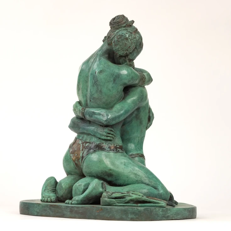 The sculpture "COVID SISTERS" was created during the global COVID pandemic. It depicts two girls in a loving embrace at the end of the world, wearing face masks reflective of that time. During that period, closeness and physical contact were something everyone feared, yet in the sculpture, it is felt profoundly.